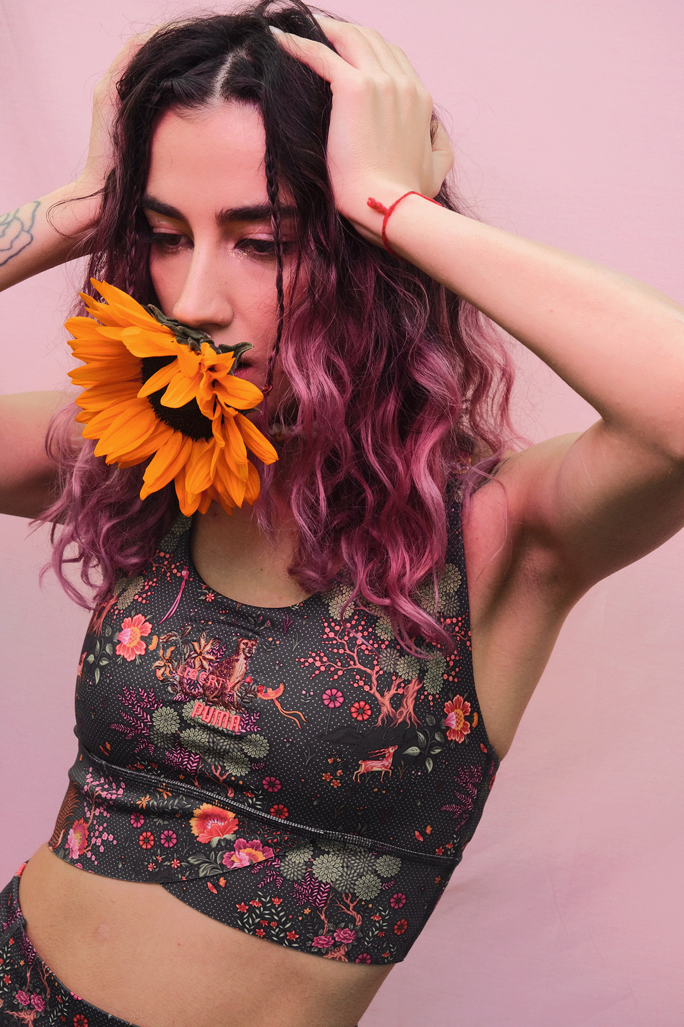 Это была съемка в рамках кампейна PUMA Wild Garden. Клиенту хотелось сделать акцент на диких цветах, изображения которых использовано в коллекции.